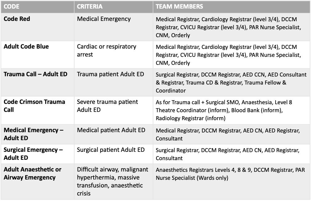 In a code crimson the Surgical SMO, anaesthesia, Level 8 theatre co-ordinator, radiology registrar, and blood bank are also informed.