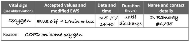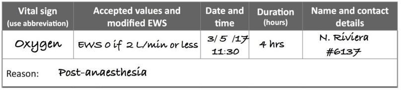 When making modifications the clinician must consider the clinical risk to the patient if vital sign abnormality is normalised. Clinical risk can be mitigated by ensuring modifications are discussed with a senior clinician and reviewed at regular intervals so they remain appropriate as the patient’s condition changes. The duration of all modifications must be documented to ensure that timely clinical review is undertaken.